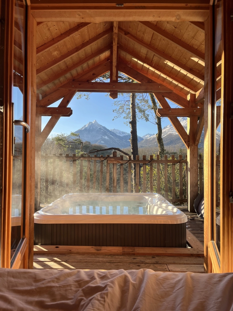 L'orientation Sud de la cabane vous ouvre les portes pour contempler la chaîne des Pyrénées. Un endroit idyllique où la fumée du café et du spa se mélangeront au réveil.