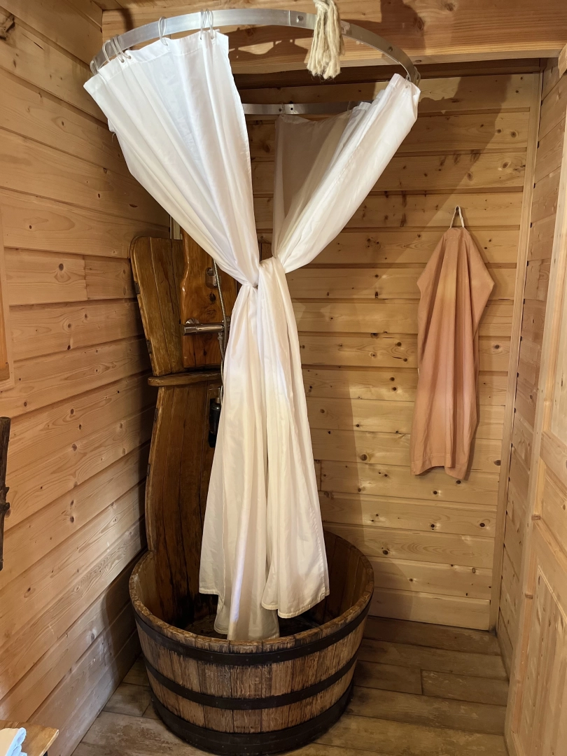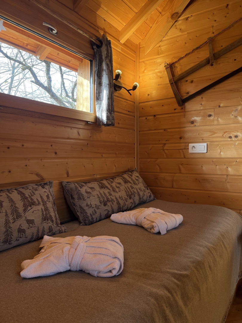 C'est le trésor caché pour votre séjour dans les arbres. Elle dispose de 3 couchages, une kitchenette équipée, chauffage et salle de bain avec douche dans un tonneau et toilette.